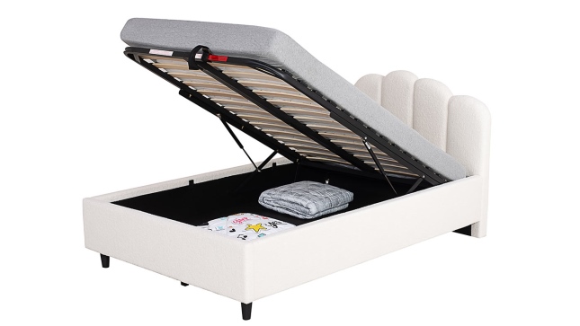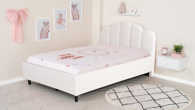 מיטה ברוחב וחצי מעוצבת ומרופדת לנוער דגם "אמילי". פרזול המיטה הינו פנימי ואסתטי ויוצר חיבור עמיד יותר של קורות העץ. בסיס המיטה וראש המיטה עשויים מעץ לבוד (סנדביץ) וריפוד בוקלה, רגלי פלסטיק.