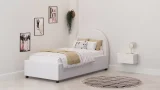 מיטה ילדים מעוצבת ומרופדת דגם "מון". פרזול המיטה הינו פנימי ואסתטי ויוצר חיבור עמיד יותר של קורות העץ. בסיס המיטה וראש המיטה עשויים מעץ לבוד (סנדביץ) וריפוד בוקלה, רגלי פלסטיק.