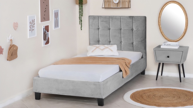 בסיס המיטה וראש המיטה עשויים מעץ לבוד (סנדביץ) עם ריפוד בד קטיפתי.